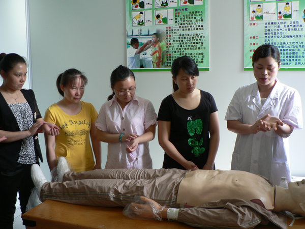 此次培训,重点传授救护新概念、徒手心肺复苏术、创伤救护、止血包扎、突发心脏病的处理等基本知识和技巧。洪医生通过步骤讲解、案例引用及现场演示等方式,让老师们掌握各种急救基本技能,并要求老师们现场操作,反复练习以巩固所学。