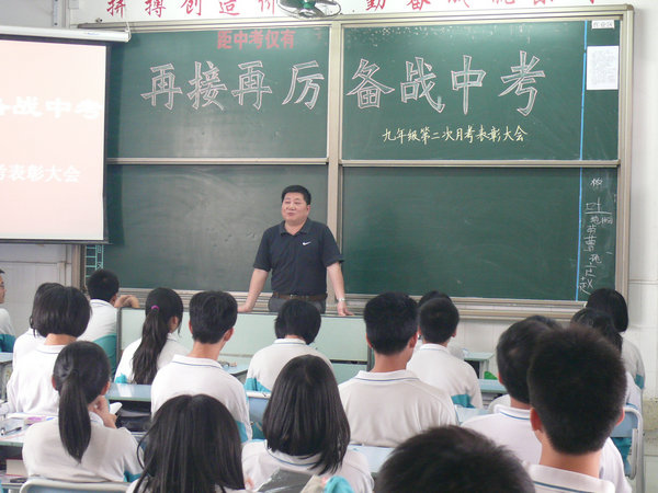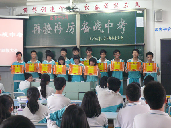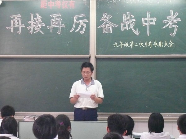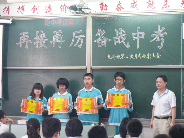 2012年4月24日下午,我校九年级第二次月考表彰会在九(1)班教室隆重举行,教学处谭主任、九年级全体师生参加了本次大会。