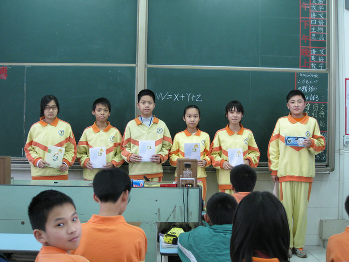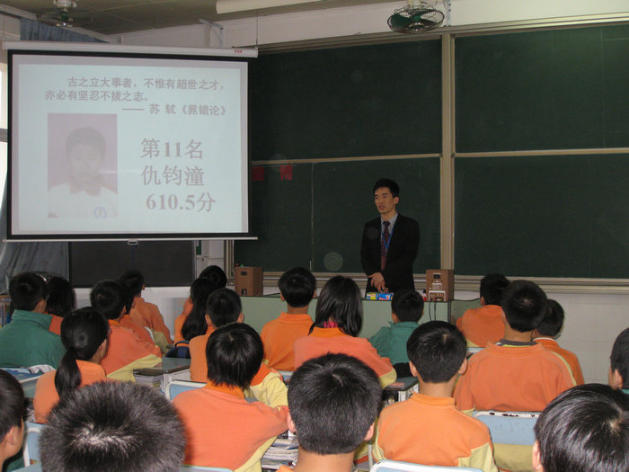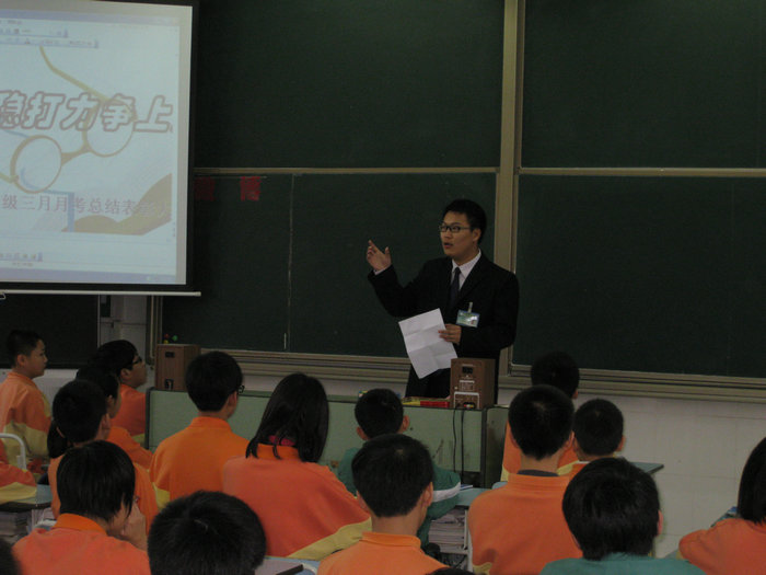 王展鹏老师首先表扬了同学们在月考当中表现出来的冲劲,希望同学们能继续把这种出生牛犊不怕虎的精神发扬下去,然后他以语文学科为切入点,告诉同学们该如何去学习,如何去提高自己的成绩,如何和老师、同学合作,并真诚的赠送给了同学们一个学习公式:w=x+y+z。