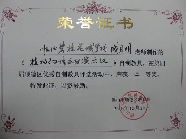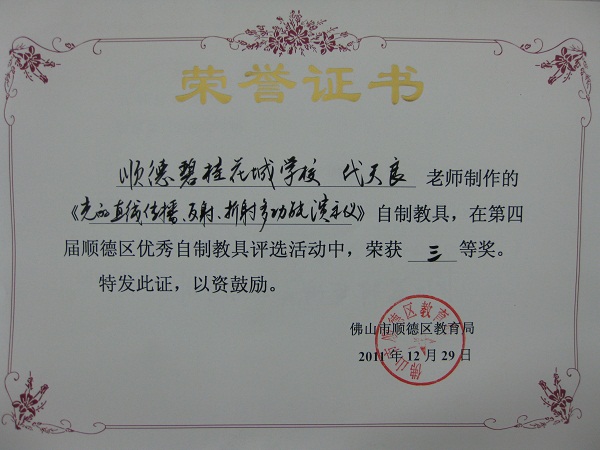 在教学处安排下,我校吉正军、成月明、张峰、代天良四位老师,经过紧张细致准备,制作视频光碟,报送文字,电子材料,参加报送了作品,经镇教育局初选,及顺德区聘请省专家现场答辩,演示,观看视频等环节评选,我校有吉正军辅导的四(3)班吉笑同学的自制教具:“一种有定时提醒功能可计数跳绳”荣获顺德区“三等奖”。代天良老师的自制教具:“光的直线传播、光的反射、光的折射多功能演示仪”获顺德区“三等奖”。成月明老师的自制教具:“植物向光性运动演示仪” 获顺德区“二等奖” 。向各位获奖老师表示祝贺。