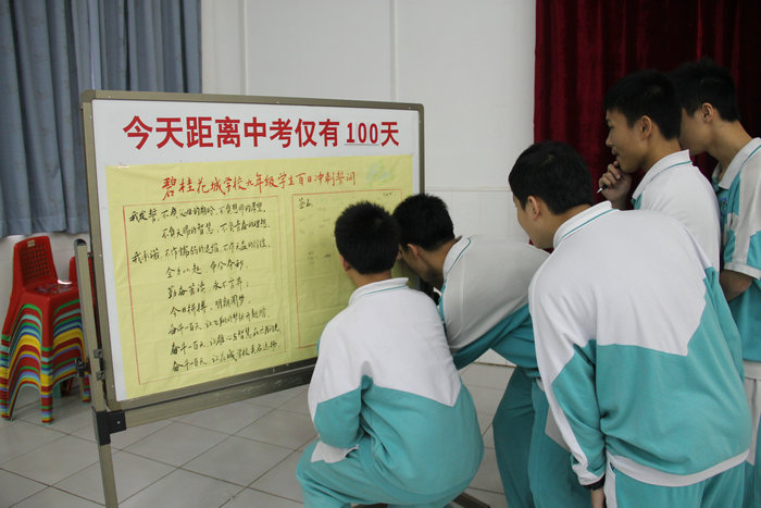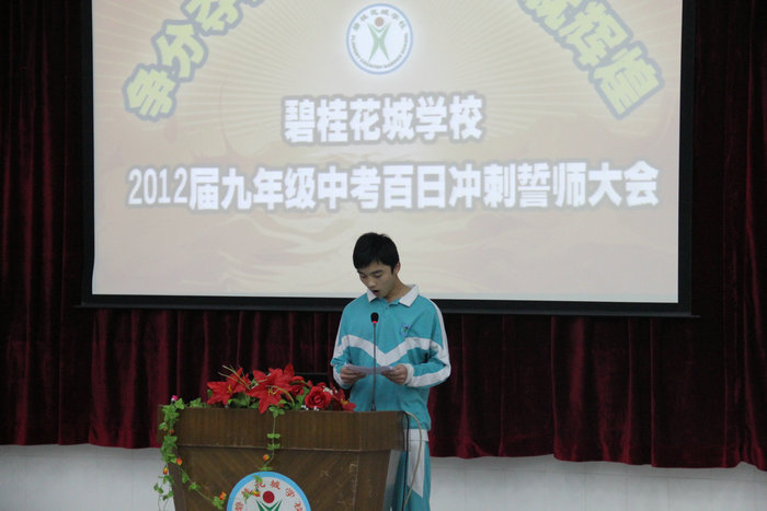 最激动人心的时刻到了,只见九年级全体同学神采奕奕,容光焕发,面向老师,在九(2)班高启源的带领下,庄严宣誓:“全力以赴,争分夺秒;勤奋苦读,永不言弃;今日拼搏,明朝圆梦。奋斗一百天,让飞翔的梦张开翅膀!奋斗一百天,让雄心与智慧在六月闪光!奋斗一百天,让花城学校美名远扬!”响亮的誓言,在室内久久回荡,激荡着每一个人的心。接着,同学们当场签名,写下了自己必胜的信念。