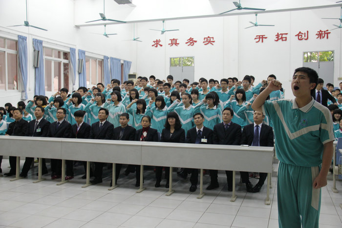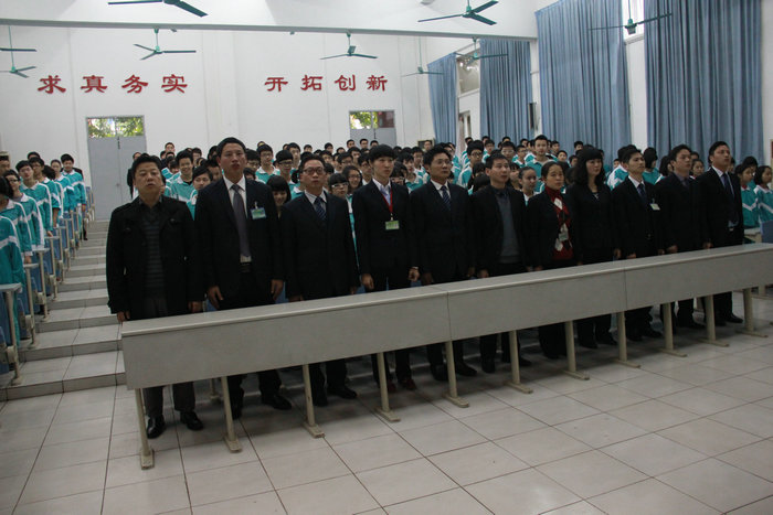 大会在雄壮的国歌声中拉开帷幕,初中部全体师生精神抖擞,高唱国歌,掀起了会议的第一个高潮。