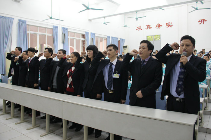 九年级10位任课教师庄严宣誓:“忠于职守,精诚团结;言传身教,以身作则!荣誉至上,同舟共济;全力以赴,永不言弃!洒汗水,昂扬斗志;战百天,创辉煌!与学生同甘共苦,为学生保驾护航!”老师们坚定的誓言掀起了会议的又一个高潮。