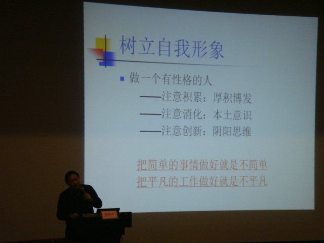 赵教授指出每个班主任都要加强自我修养,从树立正确的人生观,重视个性锻炼,正确评价自己来展开的。他举了几个特级教师的个性教学方式,但是我认为可推广性不高,那只是他们成功的方式,但是不同的学校不同的班级不同的老师不同的学生,就要有不同的方式。这才是真正的备学生,是真正的一线教师。