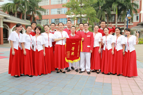 此次比赛得到了学校领导的高度重视,校长亲自挂帅,率先垂范参加到合唱队伍中来,并成立了以何国基老师为团长的核心团队――指挥何国基老师,领唱戴琦主任,钢琴伴奏彭金婷老师,舞台服装朱嘉老师。合唱团制订了详细的赛前训练计划,从选歌到排练到选服装,都倾注了核心团队每位成员的智慧和力量。