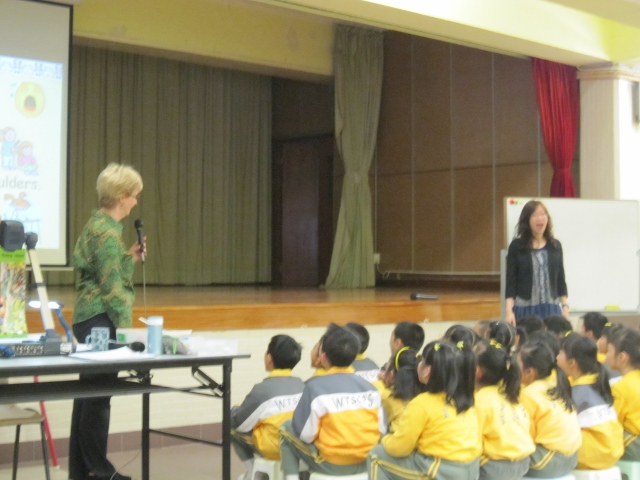 25日上午,我们参观了香港培基小学。培基小学以“信、望、爱、诚”为校训。校方为我们展示了两节优质高效的小学英语语音课和英语写作教学课,课后校长向在座的英语教师详细讲解校方在日常教学中如何组织孩子进行语音学习和写作训练的,并分享了他们最近才定稿的一年级语音教学校本课程等资料。