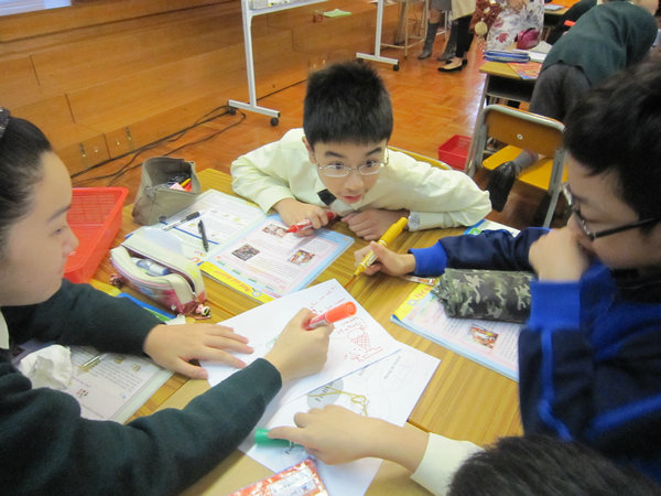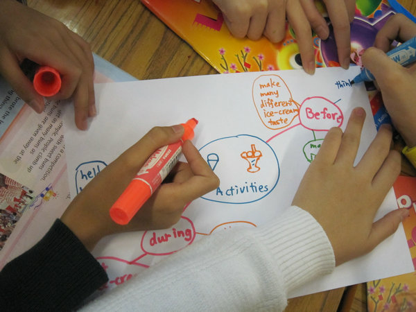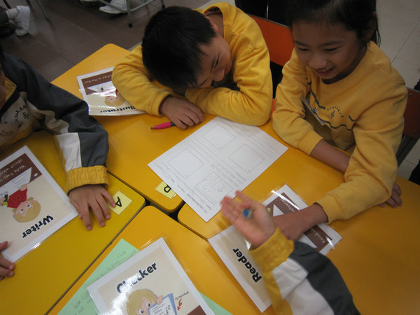 在黄大仙小学,资深外教Ms Rawson 的阅读写作课堂上,一群三年级的孩子们跟随老师开始经典童话故事 Little Red Riding Hood (小红帽) 的有声阅读,随之在老师的帮助下,找出故事中的Keywords, 用此以语篇带动词汇学习。接下来,老师要求孩子们用刚刚找出的Keywords 和自己以往已经掌握的语言知识并借助于图片来对故事进行Retell练习。紧接着开始了一个分工相当明确的小组合作学习模式,全班二十几个孩子分成了六个四人小组,先是每个小组成员轮流写出故事中的Keywords, 再用这些Keywords 在小组成员的帮助下轮流写出句子,直至孩子们能用自己写的话来复述故事。这一环节顺利完成后,每个小组的A、B、C、D四个成员又开始分别承担着说、写、绘、查的的职责,以此来完成语言输出的最后一个环节。就这样,一篇篇图文并茂、生动的绘画作文在老师的巧妙引导、处处训练、步步为梯,级级进步中不显不露地“柳自成荫,水到渠成”了。不得不令在场的各位同行们啧啧称赞。