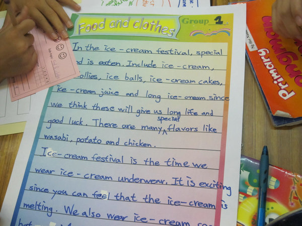 同样,培基小学的写作课主题是Create a new festival, 由于主题的设计更具开放性,这更加激发了同学们的发散性思维。通过人人参与,平等对话,真诚沟通,彼此依赖,一个个新鲜好奇、极富创造力的Ice-cream festival, Cookie festival, Monster festival, Clothes festival在孩子们的探究合作下应运而生了。