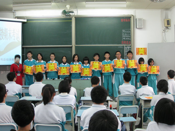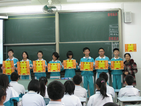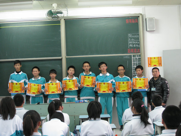 在热烈的掌声中,夺得总分前十二名的同学、夺得单科第一名的同学和进步大的同学分别上台领奖,和颁奖老师合影留念。