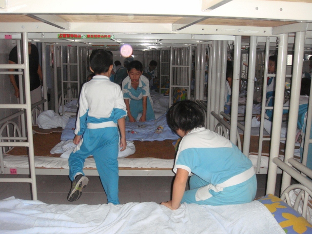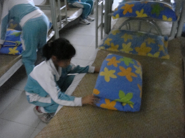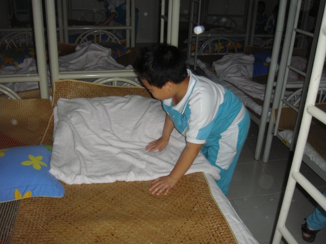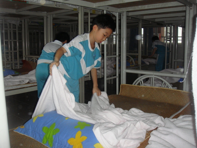 随着评委的一声令下,孩子们便迅速地叠起被子来,叠、拉、拽、铺、拍等基本动作都被运用得淋漓尽致。经过短短的两三分钟,一个个方方正正、棱角分明的“豆腐块”就规规整整地呈现在评委老师的面前。评委老师对每件“作品”进行了认真细致地评审,不时发出“好、不错、真厉害”的赞叹声!