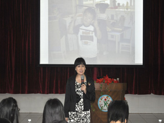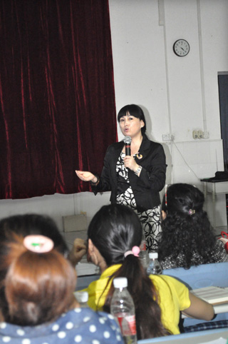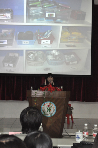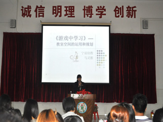 当天下午,由顺德区教育局组织,陈村教育局承办,特邀请来自南京师范大学宁谊幼教中心的的马灵雁主任给幼儿园的老师开展《区域活动创设及区域材料制作》的讲座。机会非常难得,讲座本来是下午两点钟开始,但是在一点四十分的时候,碧桂花城学校的阶梯教室里,来自陈村、乐从的各个幼儿园领导和骨干教师们已经是济济一堂了,大家都非常珍惜这次学习的机会,因此冒着雨也都早早到达了讲座会场!