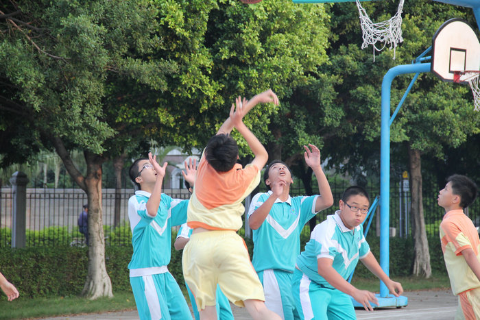 伴随着裁判员的第一声哨响,本应宁静的校园一时间人声鼎沸,热闹非常。首先进球的是八(二)班陈浩斌,他在对方第一个球不进的情况下,抢下篮板,独自运球,摆脱了重重防守后,一个漂亮的三踏步上篮,赢得在场师生热烈掌声。随后,双方比分交替上升。操场上,充满着一副副灵动色彩的画面:一个个跃动的身影、一次次激烈的身体冲撞、一声声激动的呐喊、一个个胜利的微笑、一次次沮丧的叹息……,构成了一幅幅激烈动人的画面。上半场15分钟结束,双方以12比12战平。