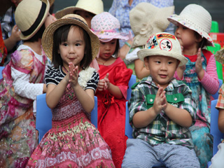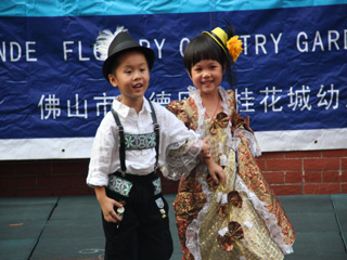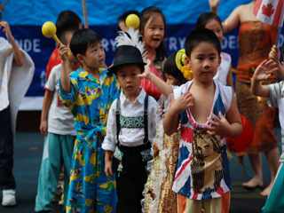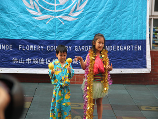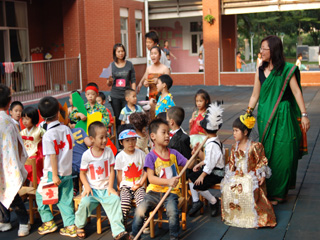 首先出场的是国际大班的哥哥姐姐们,他们为大家带来了多国的民族风情表演和服装秀。看!打头阵的是我们中国的代表团――唐装、灯笼、武侠小说中剑客,每个扮装都是那么惟妙惟肖;接着代表美国、德国、法国、加拿大、日本、牙买加、韩国、越南等国家的孩子陆续登场,为弟弟妹妹奉献了一场有趣可爱的各国民族服装表演。