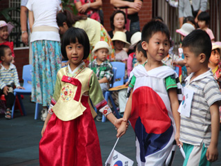 看见了哥哥姐姐的精彩表演,国际中班的孩子们也拿出了自己的“绝活”――各国厨艺来秀一下!在他们的摊位上,分别摆放着中国、日本、韩国和意大利的美食。他们运用代表国的语言,热情地招呼着在场的来宾和家长来品尝他们可口的食物。