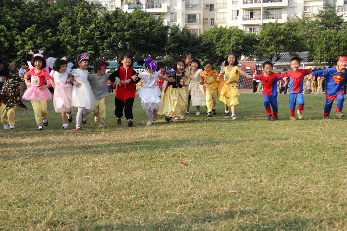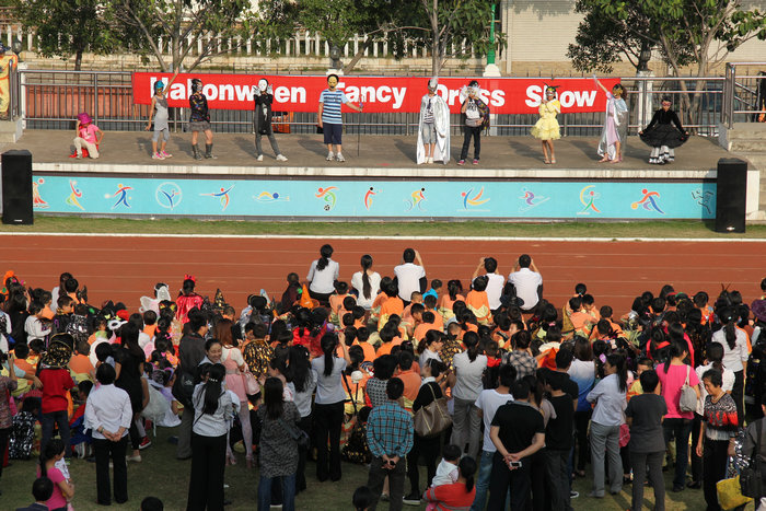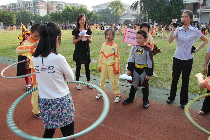 万圣节的游戏总是孩子们最喜欢的项目。服装秀之后,在操场上的各个角落都能看到孩子们开心玩游戏的身影。Apple Tower,Two-men-three-leg Racing,Ping-pang Blowing,Blind Man,Hula-hop & Riddles,Ball Catching,各个游戏点都是人头攒动。尽管如此,场面依旧井然有序。文明有理的花城学子,赢得了各位家长的交口称赞。
