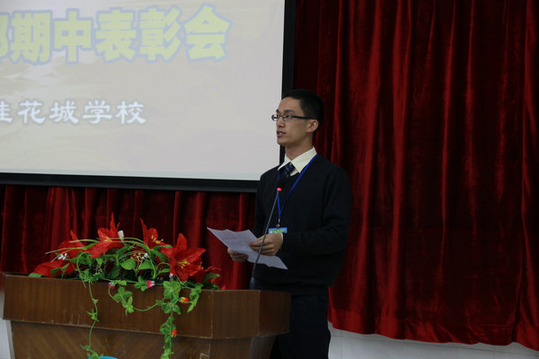 11月11日下午,我校初中部期中表彰大会在阶梯教室隆重召开,学校贺校长、教学处谭主任、戴主任以及初中部全体师生参加了会议。会议由八(2)班朱桐慧同学主持。