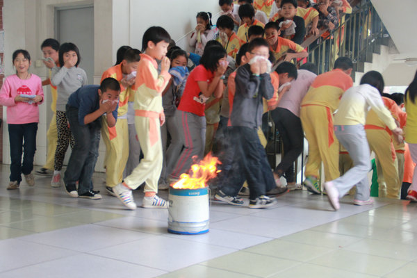 火灾疏散演习正式开始。模拟火灾现场在二楼楼梯的正前方,火势猛裂,浓烟滚滚。德育处赵主任一声令下,正在教室内上课的老师、学生们纷纷俯下身子,捂着口鼻,在老师的指引下快速有序地逃离危险区域,仅用时2分01秒,全体师生已在操场上集合完毕,不漏一人,没有伤亡。