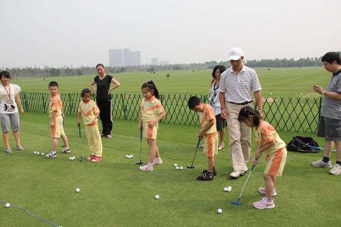 到达目的地后,孩子们在高尔夫球场资深教练带领下认真地听取了有关高尔夫运动的简单介绍,学习了简单的挥杆要领后,孩子们还在教练的陪同下轮流进行着挥杆练习,一一展现着他们精彩球技。