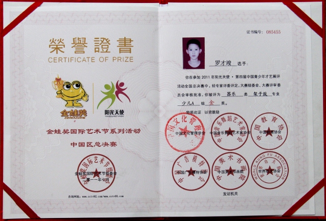 我校三年(2)班罗才竣同学在北京参加2011年阳光天使-第四届中国青少年才艺展评活动全国总决赛时,表现优异,获得器乐类架子鼓专业少儿组金奖,也为花城学校赢得了荣誉。2012年1月,他还将赴台湾参加两岸三地少儿艺术节比赛。预祝他取得更好的成绩,为我校争光添彩。