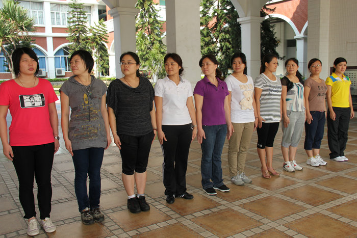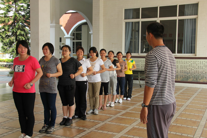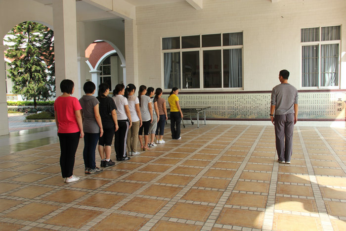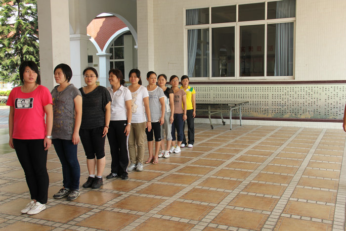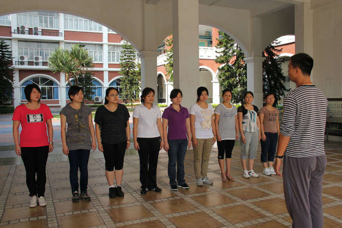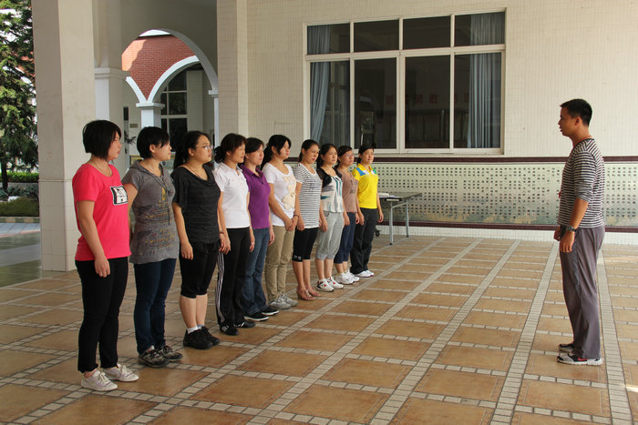 队列训练首先由袁老师做示范动作,然后再把每个基本动作一一讲授。训练场上,随着“立正、稍息”清脆的口令声,老师们一丝不苟地操练着,和着袁老师一二一二的拍子,经过反复练习,老师们进一步明确了动作要领,学会正确的立正、稍息、向左转、向右转、向后转、齐步走、正步走、跑步行进等动作。