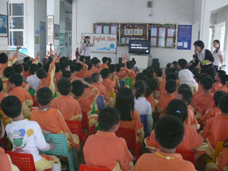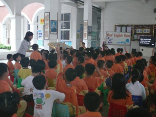 每个周五的下午,小学部的学生都会进行“英语对抗赛”,一年级的小朋友们虽然学习英语的时间不长,但也不甘示弱!在紧张对抗赛结束后,班主任带领各班学生到大堂就坐,主持人Miss Mai 闪亮登场,一声“Attention”,全场肃静,每个同学都坐得端正!本次英语秀表现形式比较活泼,英文歌曲和游戏抢答交替进行。听,一(1)班的《Ali Baba’s farm》温柔动听,一(2)班的《Yankee Doodle》活泼可爱,一(3)班的《You are my sunshine》还唤起其他班级的共鸣,而一(4)班的《On the bus》节奏感强烈,同学们都手舞足蹈!看,那高高举起的小手和那迫不及待的眼神,是要回答Miss Mai在提问关于英国文化的知识。What is the capital city of England? (London); What is an unlucky animal for the English? (a black cat); Which river is famous in U.K.? (The Severn River)……