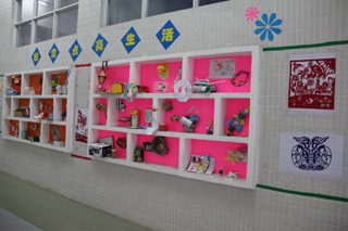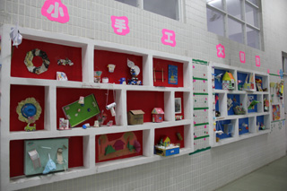 走在一楼的文化长廊上,你一定会发现独特的风景。各式各样、创意十足的手工呈现在眼前。火箭、大炮、军舰在候命;背包、帽子、望远镜为远足做准备;精美的相架里,那一对母女可亲密呢!栩栩如生的蝴蝶在飞舞,毛毛虫正慢慢地爬着回家……孩子们这些精美的手工作品都是利用生活中废旧物品,通过精心设计,变成了实用美观的手工。真可称得上是“小手工,大智慧”呀!