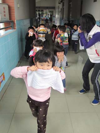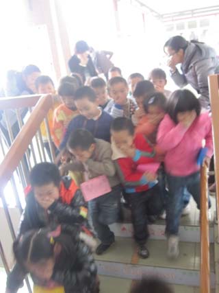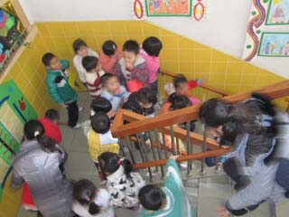 在一阵紧急的鼓声中,全体工作人员根据自己的职责和分工,立即投入到演习活动中。各班教师有秩序地组织孩子们抱着头或捂着嘴、弯着腰,迅速的撤离了教学楼。