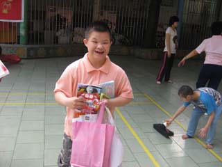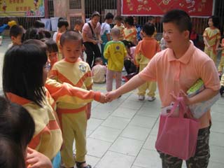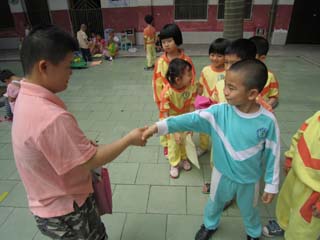 来到福利院门口,就看到福利院里的小朋友高兴地向我们挥手欢迎。进入福利院我们才发现,这是一家收留身体残疾和智障的儿童福利院。刚开始,小朋友看到这么多智障和残疾儿童,都比较害怕,不敢同他们打招呼。经过福利院李老师的介绍和鼓励,小朋友们逐渐克服了害怕的心理,将准备的礼物送到了福利院小朋友的手上。而福利院小朋友看到我们的到来,也感到非常高兴,他们主动和我们握手问好,在收到礼物之后更是迫不及待地拆开来看。