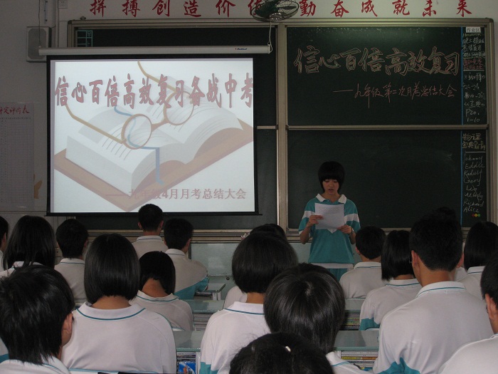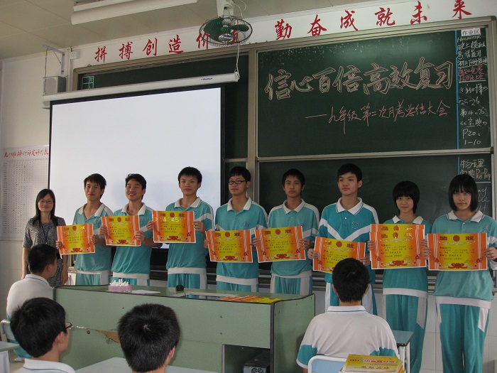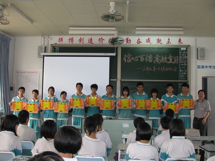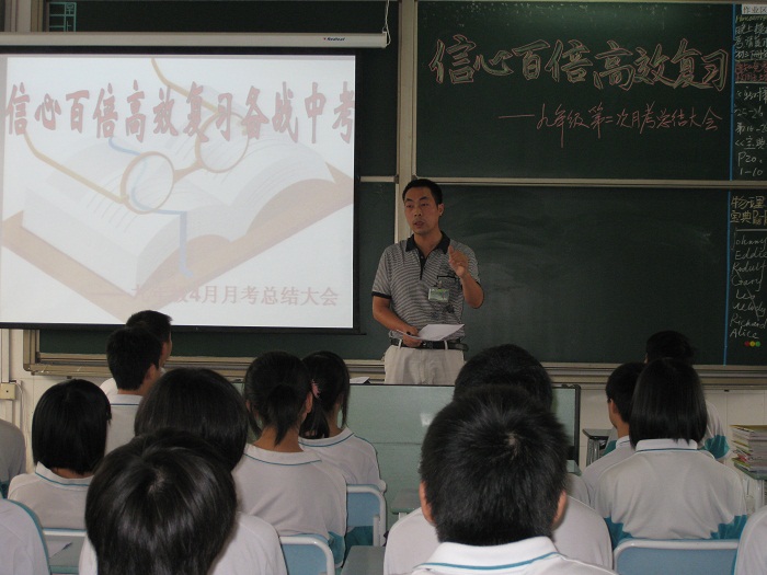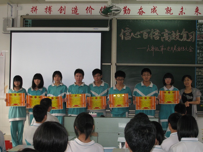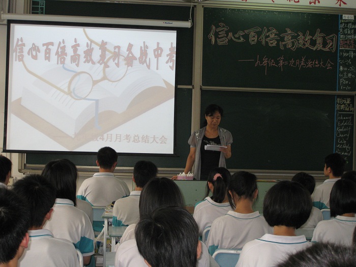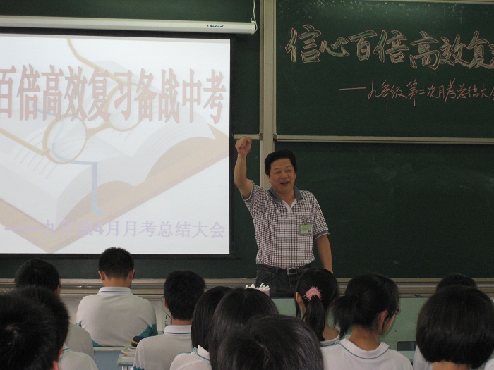 刚送走了令人振奋的体育中考后,21日下午4点我校九年级全体师生又齐聚一堂在九(1)班举行了第二次月考总结表彰大会。贺校长在百忙中也受邀出席了本次大会。