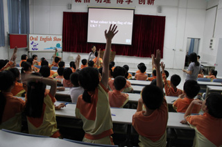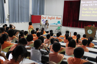 瞧!四年级的学生兴高采烈地来到阶梯教室,整整齐齐地坐好,等待着英语秀的开始。当主持人黄秋红老师出现在学生眼前时,教室内顿时鸦雀无声了。欢快的歌曲Yankeedoodle激起学生更高的热情。首先是Lucky Number的环节,同学们争先恐后地举手,面对每个问题,同学们都能流利回答。然后是Look and Say,这个环节展示了英国一些著名的城市和景点,既可以拓展同学们对英国的了解,还可以提高同学们的词汇量。最能吸引同学们的是I Know British Festervials 和Riddles。 对于西方的一些传统节日,同学们可以说是了如指掌,难不倒他们。而Riddles有一定的难度,但是,同学们就是喜欢有难度的知识,敢于挑战自我。最后,随着歌声,黄老师宣布活动结束,同学们依依不舍地离开阶梯教室。