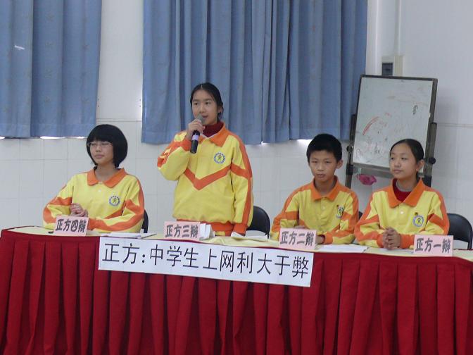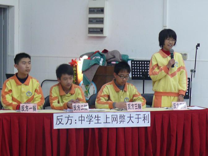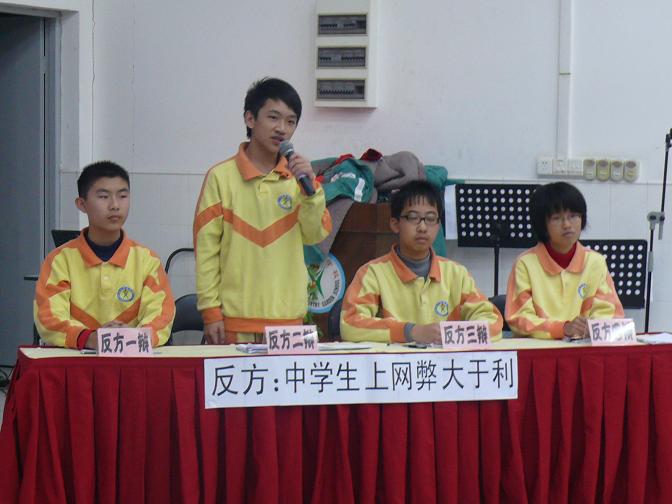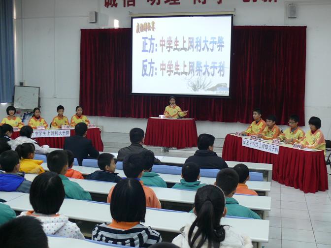 中学生上网利与弊是本场辩论赛辩论的焦点。比赛开始前,辩手们早已摩拳擦掌,自信满满,胸有成竹,随着大会主持人宣布比赛开始,八位辩手立刻精神抖擞、斗志昂扬,会场顿时热烈起来。双方引经据典,唇枪舌剑,你争我辩,你来我往,驰骋赛场,赢得掌声连连。整场总决赛高潮迭起,精彩纷呈,集思想性、逻辑性、明辨性、前瞻性于一体,充分展现了花城学子的风范。赛后,谭加文主任对双方辩手的表现作了精彩点评,贺校长也在百忙之中来此作了精彩总结。