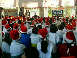 只见孩子们头戴圣诞帽,脸上洋溢着期待的目光。他们在猜想今天的圣诞大餐会是什么呢?当《Jingle Bells》音乐一响起,孩子们情不自禁地唱起了这首耳熟能详的歌,一下子就点燃了圣诞的气氛。接下来主持人Miss Luo引领着大家走进了怪物史莱克一家欢度圣诞的全英视频,本视频虽然只有短短的三分钟,但让孩子真切了解到如何来庆祝圣诞。接下来的riddles猜猜猜,孩子们大显身手,谁的眼睛厉害,谁的反应快,谁就可以得到Miss Huang给大家提供的礼物。紧张而激烈的答题之后,让我们一起唱响When Christmas comes to town来召唤Santa Claus的到来吧!可能是Santa听到了我们美妙的歌声,真的坐着雪橇来派送礼物了。圣诞老人的出场,将英语秀推向了高潮。孩子们,别着急,没那么容易就可以得到礼物,看你能否回答出关于圣诞节的问题。小意思,我们可是有备而来的,这些问题难不倒我们。一个个问题被孩子们解决,一个又一个礼物被同学们领走。看着张张热情洋溢的笑脸,Miss Luo决定让大家一次乐个够,一起走进最后一个环节――找不同,这可是孩子们的强项。这一环节得到礼物的同学又不少。看着他们的张张笑脸,我们感受着欢乐祥和的气氛。活动最后,全体老师与孩子们一起合唱We wish you a Merry Christmas,为此次活动画上了圆满的句号。