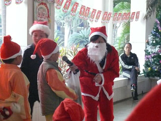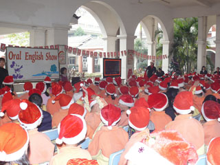 孩子们在Miss Lulu的带动下,欢快地演唱“We Wish You a Merry Christmas”。“圣诞老人来啦!”孩子们欢呼着。两位圣诞老人提着沉沉的礼物向孩子们走来。“Merry Christmas!” “Merry Christmas!”孩子们热情地向圣诞老人打招呼。圣诞老人接着和孩子们一起玩“Simon Says”的游戏。这项活动把圣诞Party推向高潮。接下来,各个年级歌唱大比拼。首先是一年级的小朋友演唱“You are my sunshine”,整齐可爱的动作赢得阵阵掌声。二年级和三年级分别演唱“I love my family”以及“When Christmas comes to town”,把全场同学都带动起来了,孩子们都举起小手,挥动着。最后是圣诞知识抢答,孩子们热情高涨。孩子们不但玩得很开心而且还学到各种圣诞的知识。