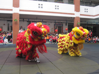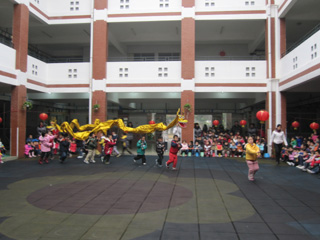 活动第一炮:舞狮和舞龙。表演者是我们学校的舞狮队和幼儿园大四班的孩子们。看,这两只狮子的舞姿勇猛而雄伟,气概非凡!随着鼓声时而动、时而静,时而英姿煞爽、时而可爱搞怪。孩子们看得可开心了。最后以一首《祝福你》把表演活动推向了高潮,大家都在操场上一起高歌跳舞。