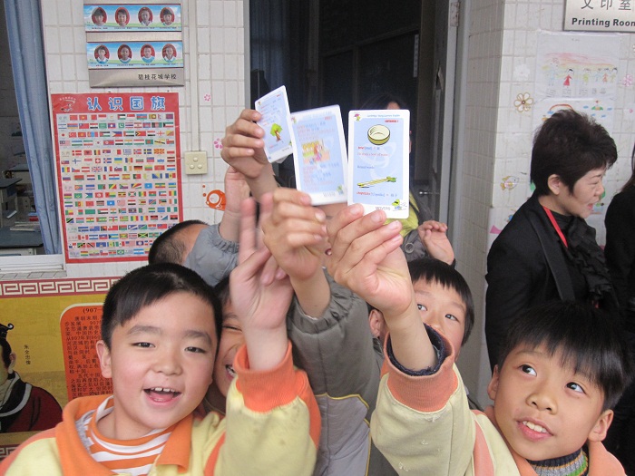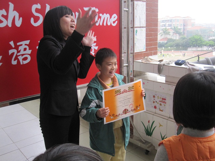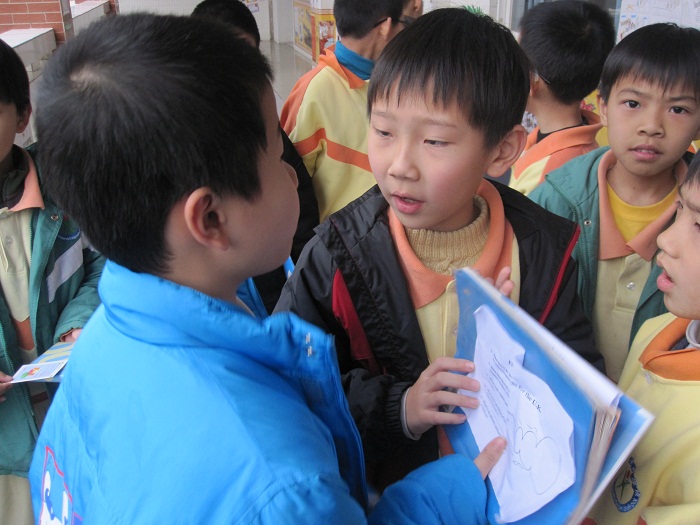 他们一问一答,两个班级都不服输,做小裁判的这下子难倒了,记分牌该判给谁呢?我凑前一听,原来他们正在进行英国文化知识的问答:What is UK stand for? ---United Kingdom. Who is the president of the UK? --- Queen Elizabeth II. What is the capital city of England? --- London. What does the U.K. include? ---England, Scotland, Wales and Northern Ireland. What is an unlucky animal for English? ---A black cat. 这些知识他们都知道呀!哦,在随后的访问中得知,原来花城学校今年暑假将要组织第一届的英国夏令营,现在整个校园已经布置了英国文化的知识板,而各年级段也开始进行英国文化教育,三年级组首先以英国文化为题,打响了英语挑战赛的头炮!