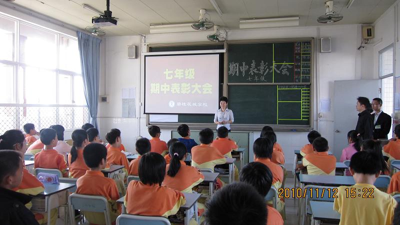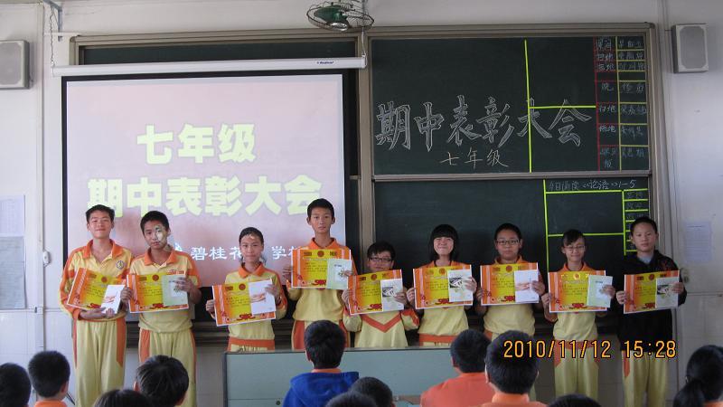 11月12日下午,七年级期中表彰大会在七(2)班教室隆重召开,教学处戴主任以及七年级全体师生出席了会议。会议由七(2)班班长罗昭兰同学主持。
