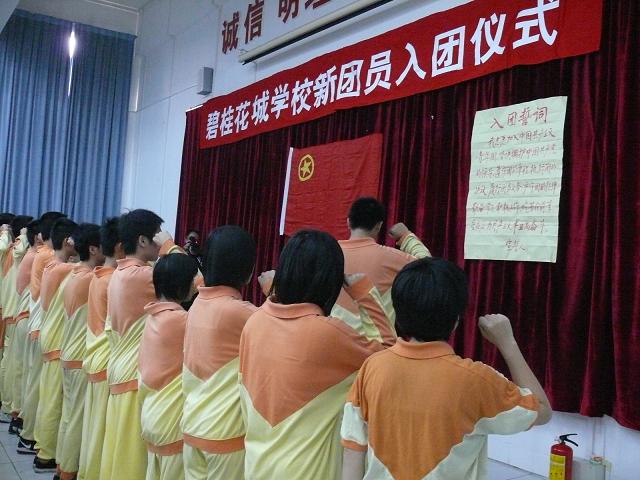 仪式开始,首先是观看团总支制作的《碧桂花城学校2009年团队工作总结》专题短片,近五分钟的视频,回顾了我校去年的团队工作开展情况及取得的成绩,博得了一片赞许的掌声,使即将加入共青团的入团积极分子士气振奋,对团组织充满了向往。
