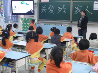12月10日下午,碧桂花城学校的全体同学上了一节难忘的主题班会――关爱残疾人。在班会课上,老师们通过让学生观看残疾人的生活视频、了解残疾人用品以及体验盲人生活、体验不会说话的生活、体验没有手的生活等一系列的环节,使学生体验到残疾人承受着正常人无法想象的艰辛和痛苦,更真切地感受到残疾人坚强的品质。学生们都纷纷发出内心的话语“要关心残疾人,帮助残疾人”。通过此次活动,同学们懂得了在生活中如何关心残疾人,明白一句温暖的话和一个简单的动作都能帮助他们很多。