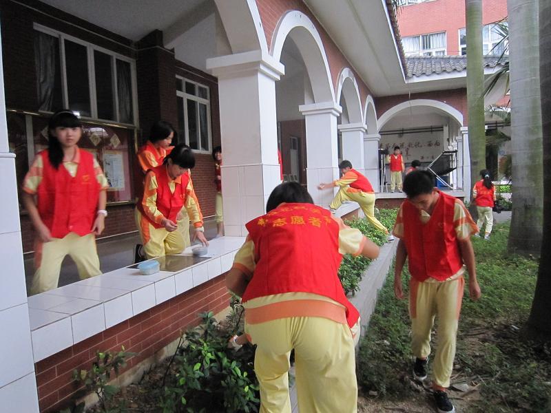 下午五点整,学生会成员准时到一楼大厅集中,统一换上了“碧桂花城学校志愿者”红色马甲,穿着红色志愿者服装,同学们感到无比自豪,热情高涨。指导老师向同学们明确了服务内容和注意事项后,大家就开展行动了。