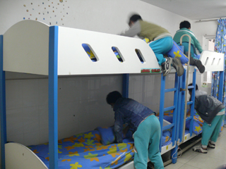 比赛前,年级组制订了详细的比赛规则,各位评委早早按规则来到比赛场地,同学们也充满了自信、激动。“嘟……”哨声一响,同学们纷纷来到自己的床铺上动手整理,叠、拉、拽、铺、拍、刮,一气呵成,很快,一个个有棱有角的“豆腐块”出现了,床单也平整得好像正被人拉紧四个角。