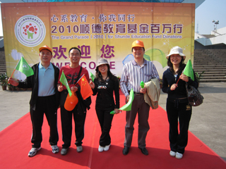 11月7日上午,顺德举行2010教育基金百万行活动,返乡参加世界顺德联谊总会第七届恳亲大会――来自世界五大洲20多个国家和地区的60多个顺德社团超过1000名乡亲也一同参与活动。