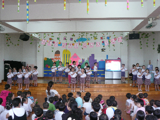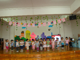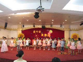 而此时,花城幼儿园大班、小小班的小朋友和老师们也怀着激动、兴奋的心情走进小歌剧院,大家要在这里一起进行庆祝中秋节的活动呢!看!节目开始啦,小朋友的表演真是精彩呀!大班的小朋友们为大家表演了动感的舞蹈《月亮公主》、《印度舞律动》、英语歌表演《If you are happy》、打击乐演奏《我爱北京天安门》还一起朗诵了儿歌《中秋节》、和大合唱《爷爷为我打月饼》。大班的哥哥姐姐的节目真是精彩极了,赢得了小小班弟弟妹妹热烈的掌声。最后,小朋友和老师们都走上舞台,跳起了欢快的舞蹈,整个小歌剧院里都是欢歌笑语,每个人的脸上都露出了开心和快乐的笑脸。