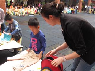 中班和小班年级组特别把爸爸妈妈们也请到了比赛现场。孩子们和爸爸妈妈合作扫垃圾、整理书包,帮爸爸妈妈穿衣服,有趣的亲子劳动竞赛让整个赛场充满着欢声笑语。