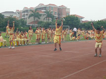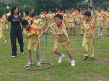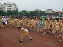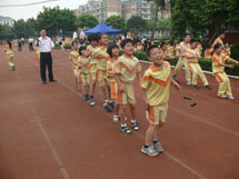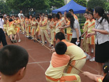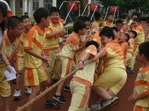 为了体现阳光体育精神,促使学生们积极参与到快乐运动中来,学校把此次趣味运动会比赛分为A、B、C三大组,设计了见龙卸甲、蚂蚁过河、鱼跃龙门、同心协力、趣味拓展体验、保龄球、障碍接力、8字跳绳、拔河、圣火传递、不倒翁、大风车、定点投篮接龙、往还运球接力、拔河等游戏项目。