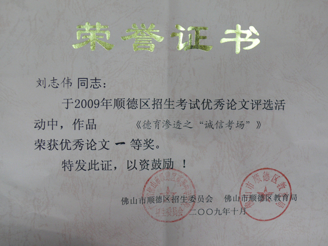 在2009年佛山市顺德区招生考试优秀论文评选活动中,我校刘志伟老师的论文《德育渗透之“诚信考场”》荣获优秀论文一等奖。