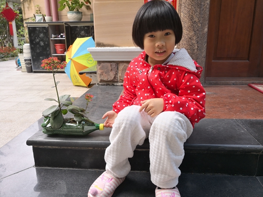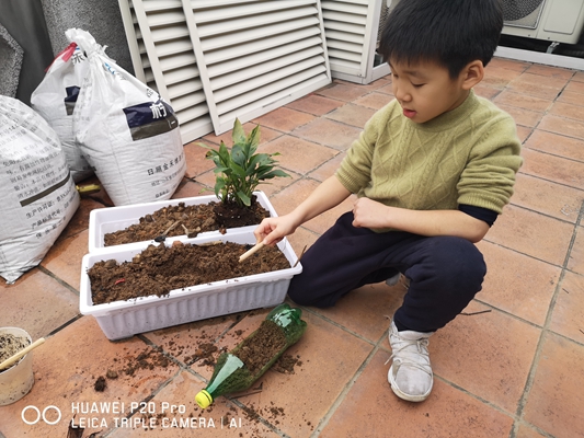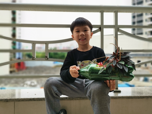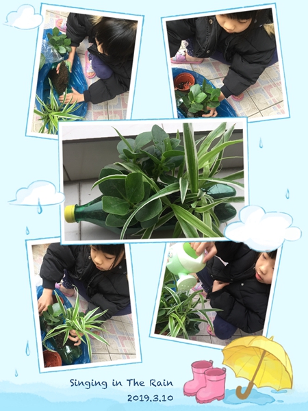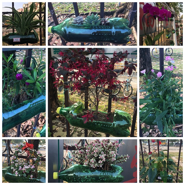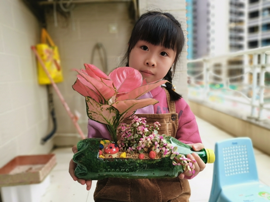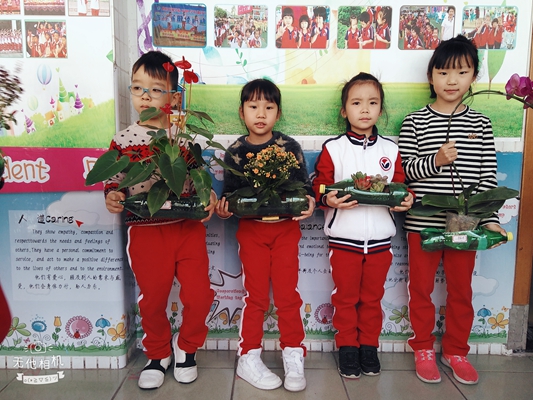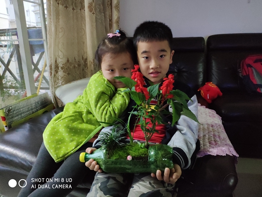 春风吹绿了嫩芽,吹绿了小草,也吹动了孩子们的热情。在接到学校的活动通知后,孩子们就开始收集绿色饮料瓶,挑选绿色的小植物,向爸爸妈妈学习如何制作小盆栽。他们的年龄虽小,但是在爸爸妈妈的帮助下一切做得有模有样。去花市选花草,裁剪饮料瓶,把花草移植到“新家”——饮料瓶里,给花草浇水……看!孩子们做的这些小盆栽多可爱,多精神呀!