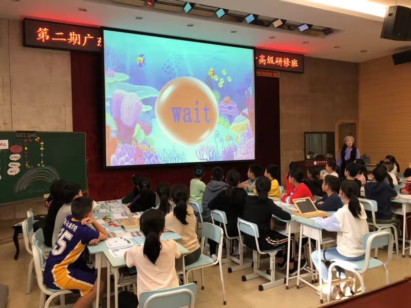 开班仪式结束后,白云专家结合自然拼读和绘本故事,给研修班的学员和本校的老师们,呈现了一堂主题为《Wait Wait Wait》的英语课。白云专家带领我们进入了美妙的英语世界。她那优美的发音,循序渐进的教学设计,活泼清新的课件设计,以及课堂上对孩子们循循善诱的引导,给在座的老师们留下了深刻的印象。