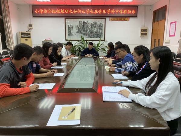为了进一步提高综合组教师的专业素养和教学能力,2019年4月15日晚,综合组全体教师齐聚一堂,开展了一场以《如何让学生在音乐学科中体验快乐》为题的微教研活动。