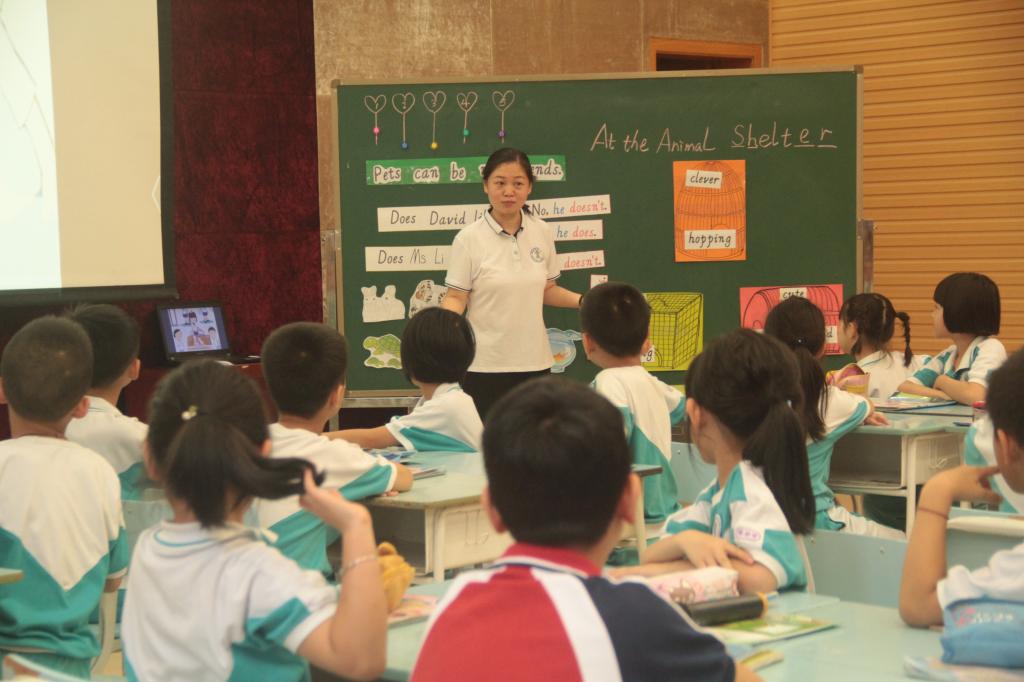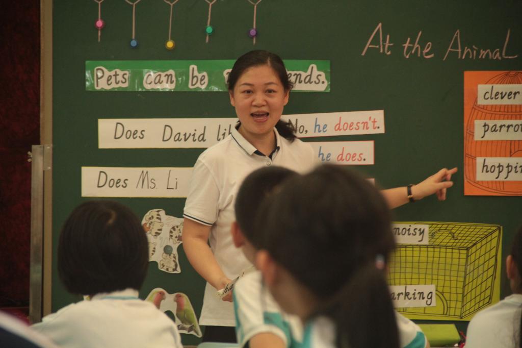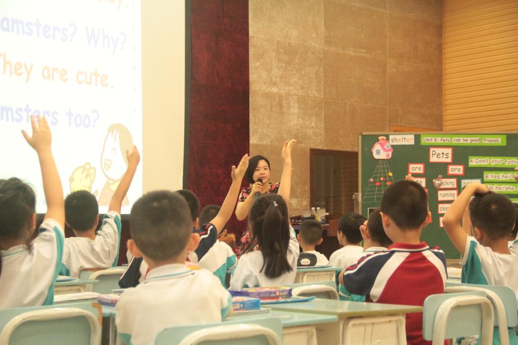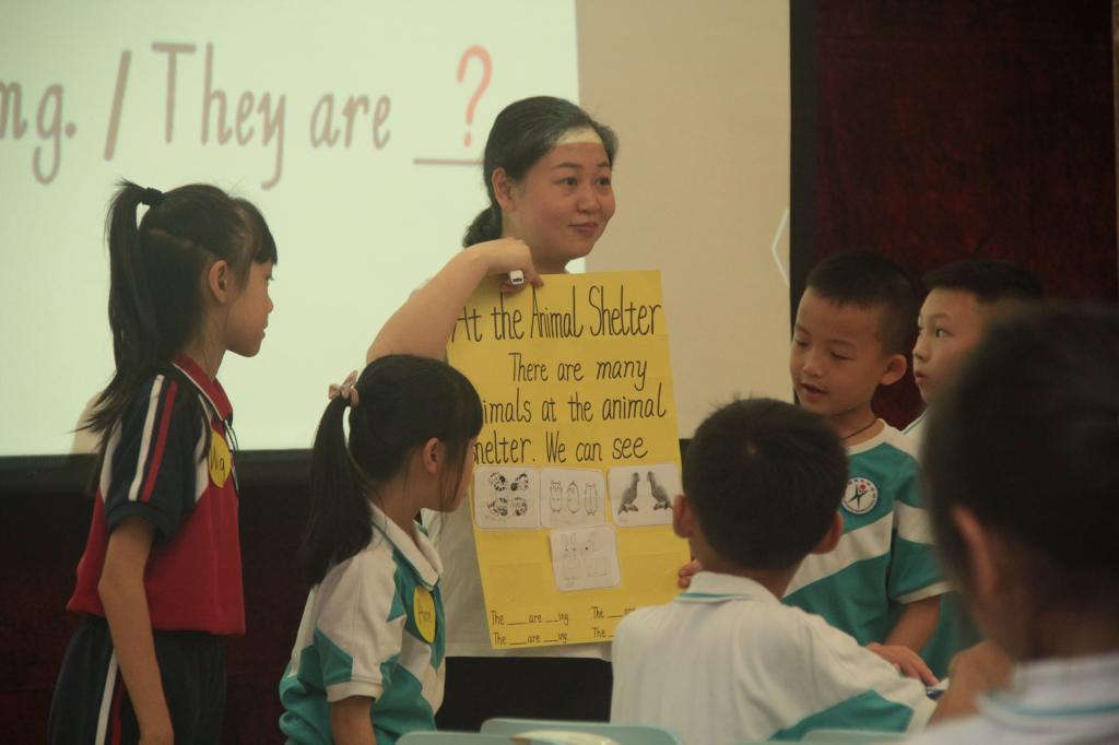 参赛的教师都是由集团各校选拔出来的学科精英,授课内容统一是小学英语牛津版2B Unit 6 Pets can be my friends.我校担任此次优质课大赛的授课老师是杨怡如老师。杨老师在热情洋溢的师生问候之后,巧妙地以卡通人物David引出了主题——Pets can be good friends.她在课上全面展示了自己扎实的教学基本功和生动的现场表现力。充实的课堂设计,务实的教学风格,丰实的教学效果,让杨老师的课堂精彩纷呈。她的出色表现,充分体现出碧桂花城学校教师锐意进取的积极风貌,同时也体现出英语教研组通力合作的团队精神。