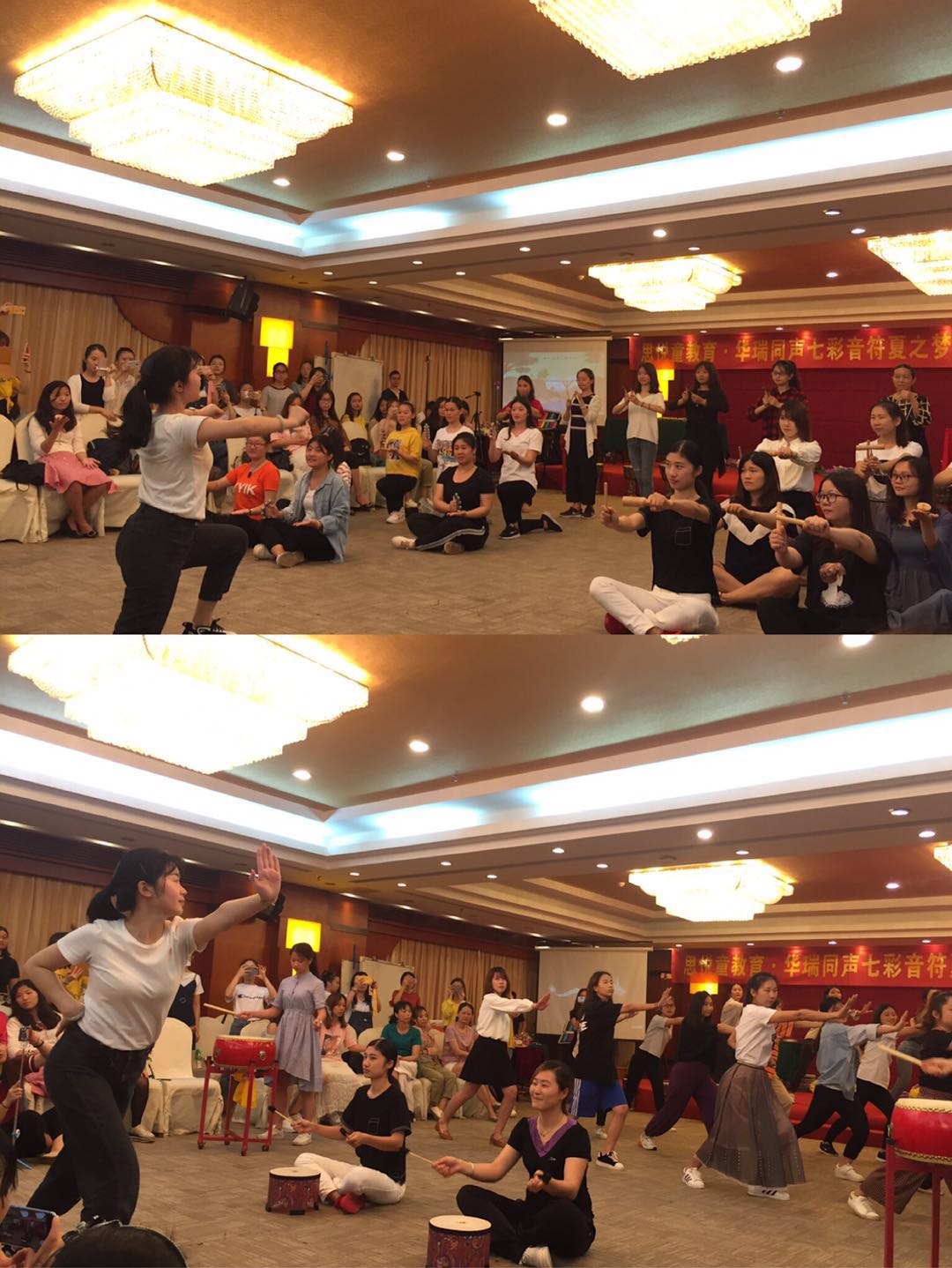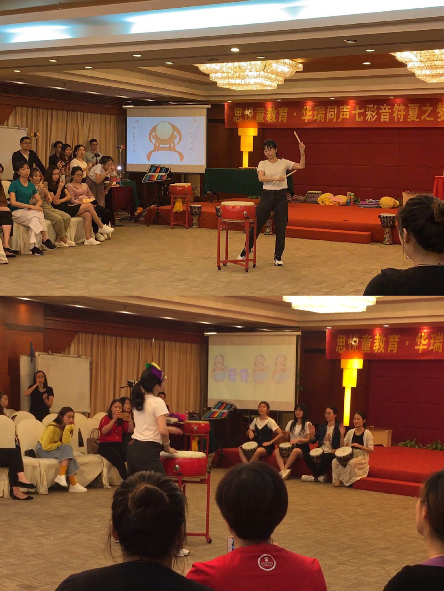紧接着程老师向我们介绍奥尔夫音乐创编不仅有韵律操,还有国学、中国风、流行音乐等不同元素。程老师举例示范了国学音乐《长歌行》的创编。活动最后,程老师介绍了如何将各种不同的乐器运用到音乐活动中的方法。每种乐器都有自己独特的魅力,那如何让不同的乐器在同一音乐活动中相辅相成,巧妙融合呢?老师以《龙的传人》和《送别》为例,在活动中加入非洲鼓、木琴、大地鼓、中国鼓等器乐,创编了一场音乐盛宴。